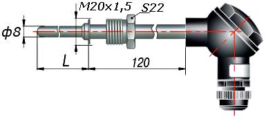 Обеспечивает герметичное соединение за счет подвижного резьбового штуцера. • Диапазон измеряемых температур: - 40 ... +800° С зависит от НСХ (номинальная статическая характеристика) L (ХК) - 40 ... +600° С K (ХА)- 40 ... +800° С