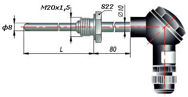 Обеспечивает герметичное соединение за счет неподвижного резьбового штуцера. • Диапазон измеряемых температур: - 40 ... +800° С зависит от НСХ (номинальная статическая характеристика) L (ХК) - 40 ... +600° С K (ХА)- 40 ... +800° С